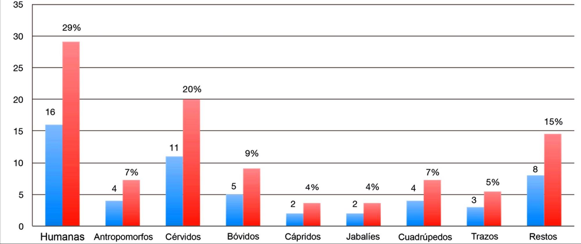 Los resultados obtenidos en la documentación realizada presentan diversas novedades en cuanto a las representaciones y a la identificación de detalles iconográficos del friso, tanto en relación con las pinturas como con los grabados. Por un lado, el inventario se incrementa hasta las 55 unidades pintadas, incluyendo figuras identificables y restos indeterminados (véase gráfico 1); por otro, se amplía la zona de los grabados en la pared oeste. Además, se han detectado nuevos procedimientos técnicos en la aplicación pictórica de perfilados y rellenos, así como en la combinación alterna de colores, repintes y restauraciones.