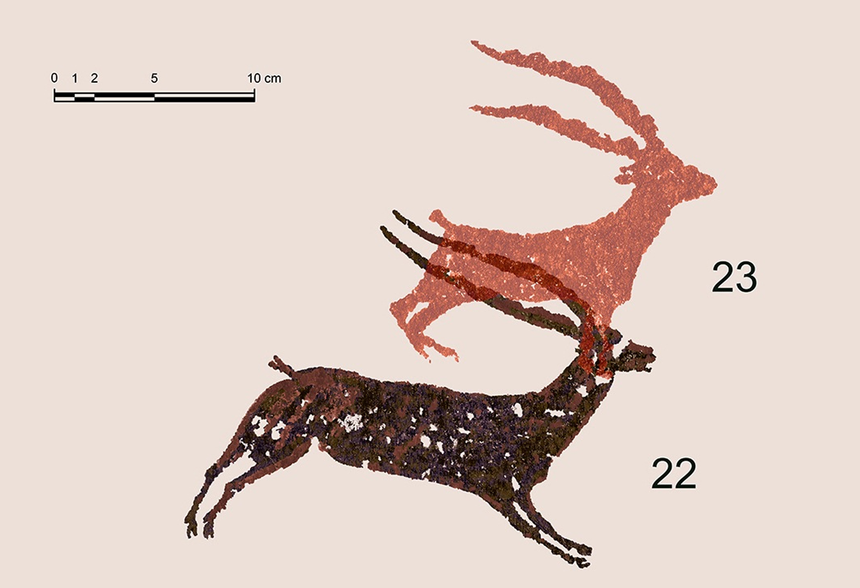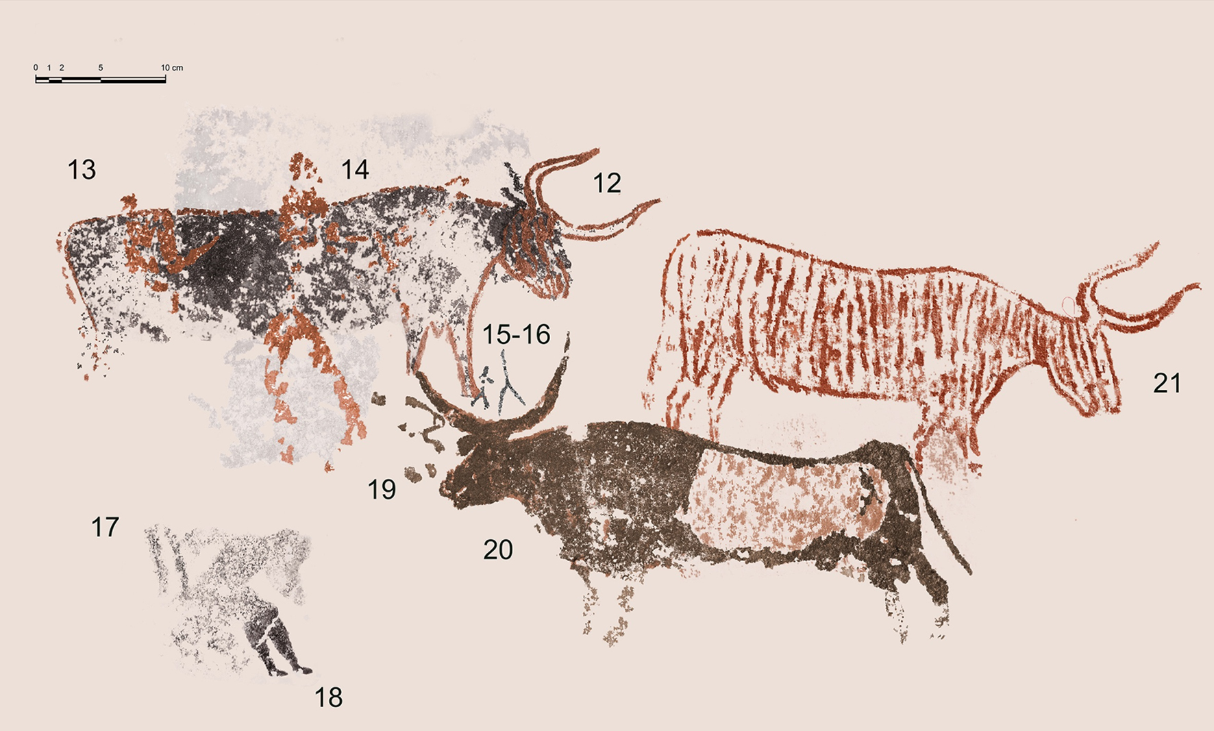 A nuestro parecer, las evidencias relativas a la aplicación de los colores, las superposiciones y el estudio de las composiciones permitirán replantear y afinar el conocimiento sobre el proceso de ejecución del mural. En este sentido, será necesario profundizar en el estudio de las figuras repintadas y restauradas, así como de las bicromías y de los grabados más antiguos —especialmente los anteriores a las pinturas de los bóvidos núm. 12, 20 y 21—, ya mencionados en trabajos precedentes[37] y que consideramos elementos integrantes de la etapa inicial del conjunto rupestre del Cogul.