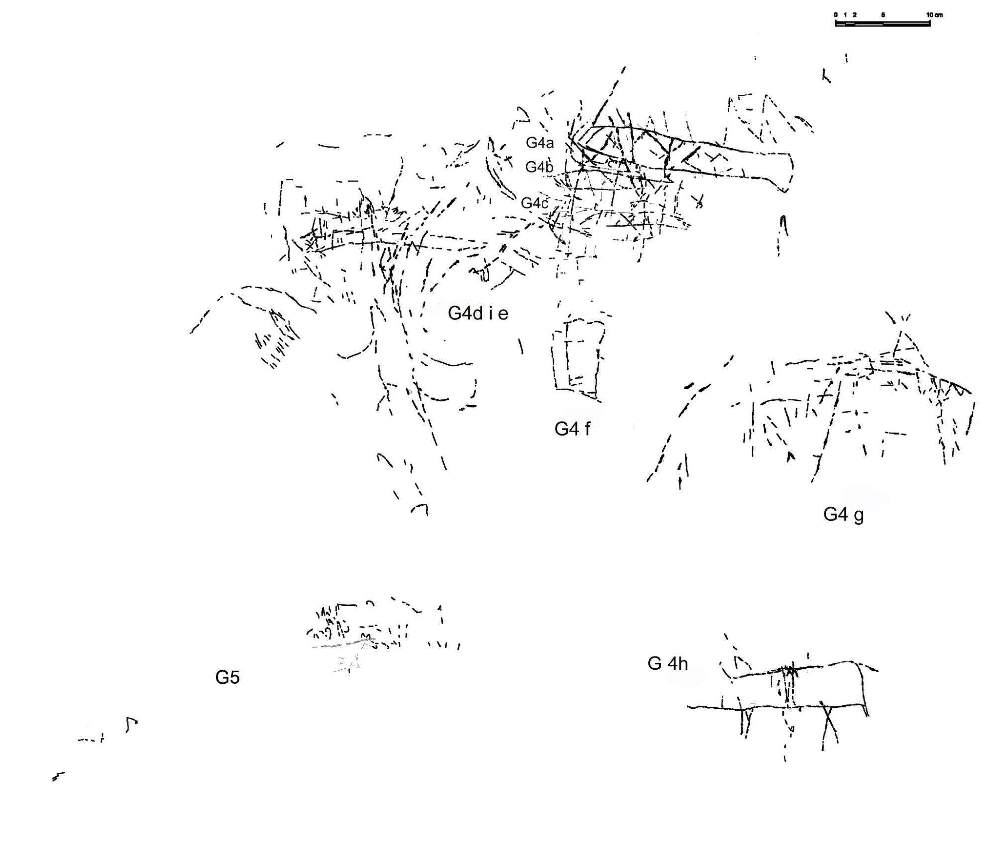 Agrupación situada sobre la parte posterior del toro pintado (núm. 12 y G6) y que se extiende hacia la izquierda. Está formada por tres peces: el primero descubierto por M. Almagro, un segundo presentado en el calco de 1985 y un tercero registrado en la presente documentación (G4a, G4b y G4c); un posible cuadrúpedo (G4d), y una amalgama de líneas verticales e inclinadas (G4e). Entre los trazos se insinúa algún posible cuadrúpedo y formas geométricas. En un nivel inferior se observa un pequeño rectángulo irregular en posición vertical (G4f). En la base del friso se registran dos unidades más: un entrelazado de líneas que podría corresponder a un cuadrúpedo esquematizado (G4g) y otro con trazos verticales interiores sostenido por líneas angulosas —posibles patas— (G4h). Algunos de estos grabados corresponden a las figuras 10, 11, 15, 44 y 45 de la descripción de M. Almagro[31].