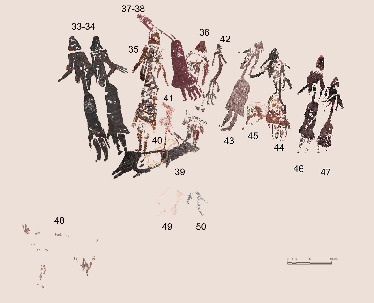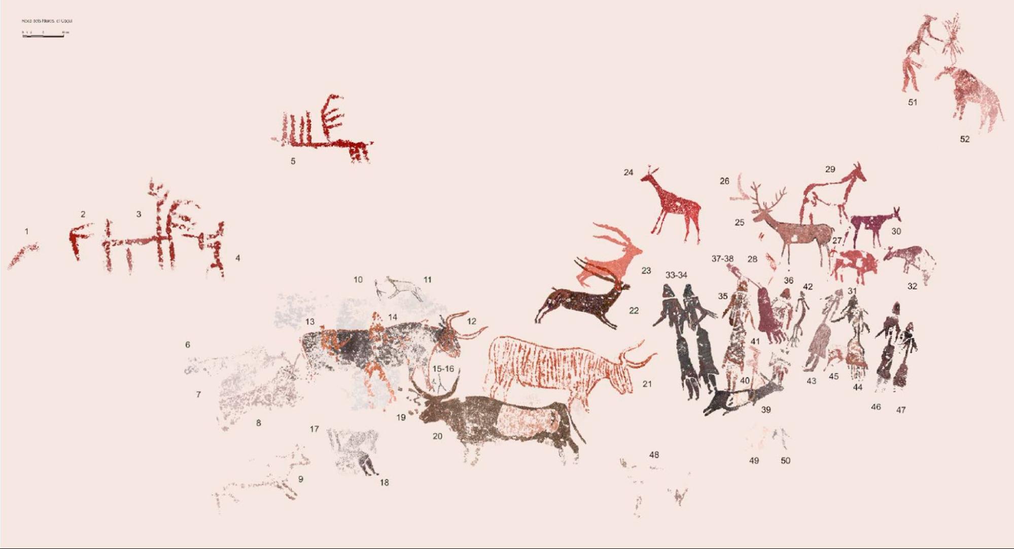 En cuanto al registro de las nuevas representaciones pintadas, estas se sitúan principalmente en la zona inferior izquierda del abrigo (núm. 6, 7, 8 y 9), y evidencian que el mural se extendía por esta área, actualmente dañada por la erosión natural y antrópica del soporte. Otros resultados destacables son: el hallazgo de un pequeño cuadrúpedo perfilado (núm. 40) situado sobre la cierva negra (núm. 39); la distinción del sexo del bóvido (núm. 21); las bocas entreabiertas de los bóvidos (núm. 12 y 21); la mejor definición de un antropomorfo dudoso (núm. 41); la detección de una bolsa con tirantes en la mujer núm. 35, y la identificación de una funda peneana en la figura masculina núm. 51. Todos estos detalles contribuyen a ampliar el conocimiento de los contenidos temáticos del mural.