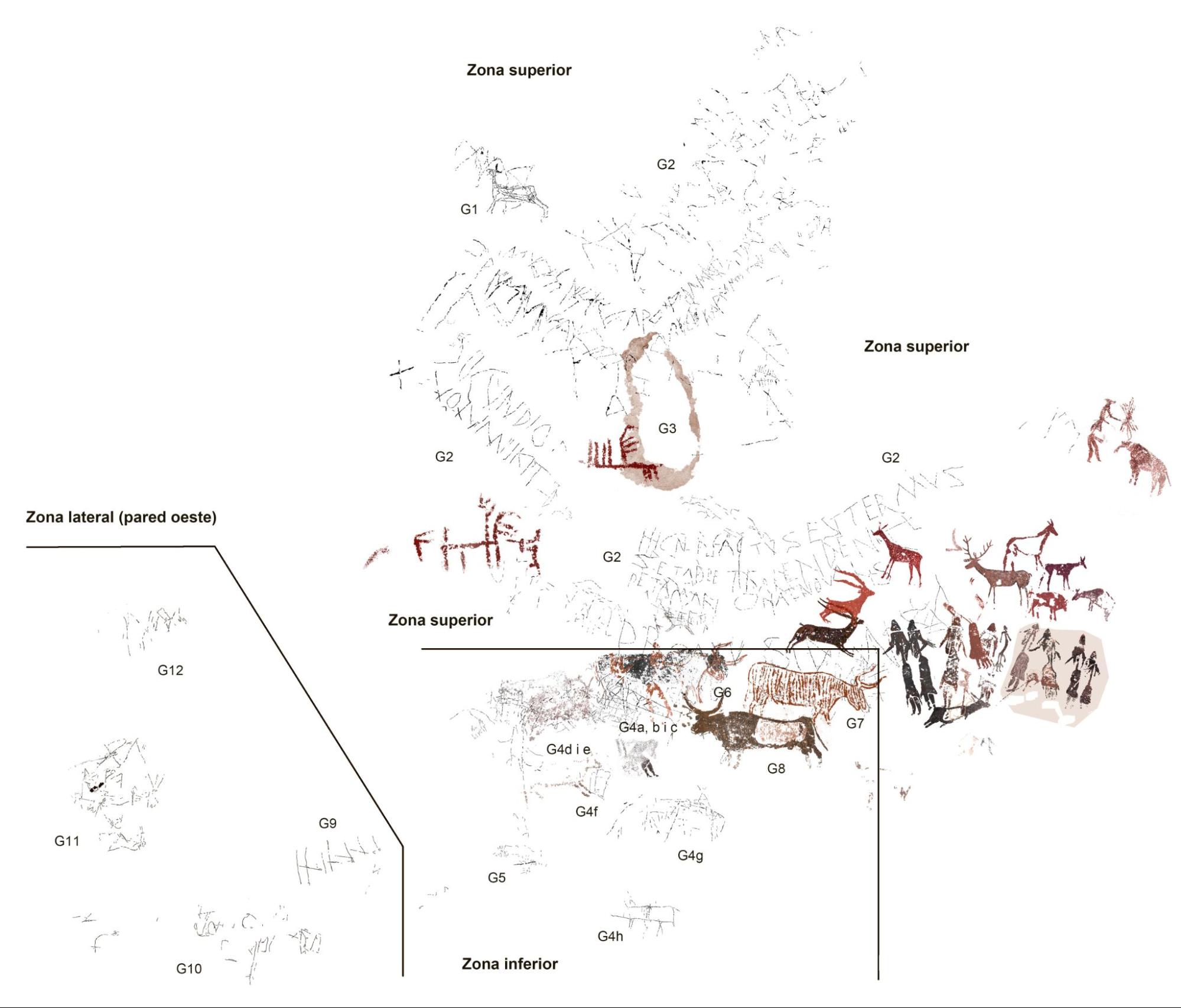 Los resultados obtenidos en la documentación realizada presentan diversas novedades en cuanto a las representaciones y a la identificación de detalles iconográficos del friso, tanto en relación con las pinturas como con los grabados. Por un lado, el inventario se incrementa hasta las 55 unidades pintadas, incluyendo figuras identificables y restos indeterminados (véase gráfico 1); por otro, se amplía la zona de los grabados en la pared oeste. Además, se han detectado nuevos procedimientos técnicos en la aplicación pictórica de perfilados y rellenos, así como en la combinación alterna de colores, repintes y restauraciones.