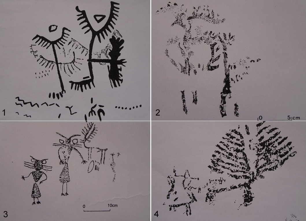 El brujo de Los Letreros no sería la única figura que admite una interpretación antropológica en el arte rupestre esquemático. Recordemos la existencia de los hombres-ciervo[57] de Nuestra Señora del Castillo (Almadén, Ciudad Real) (Figura 3, 1); o de la Cueva del Gitano (Yeste, Albacete) (Figura 3, 2); o bien la presencia de los mujeres-abeja, dotadas con pies de ave, y con ciervo oracular de Santa Elena (Despeñaperros, Jaén) (Figura 3, 3); o bien el espectacular ciervo con cornamenta arboriforme de la Tinada del Ciervo I (Nerpio, Albacete), donde el animal se une en simbiosis con el árbol (Figura 3, 4); o los hombres con múltiples brazos de la Cueva del Mediodía, también arboriformes (Yecla, Murcia) (Figura 4).