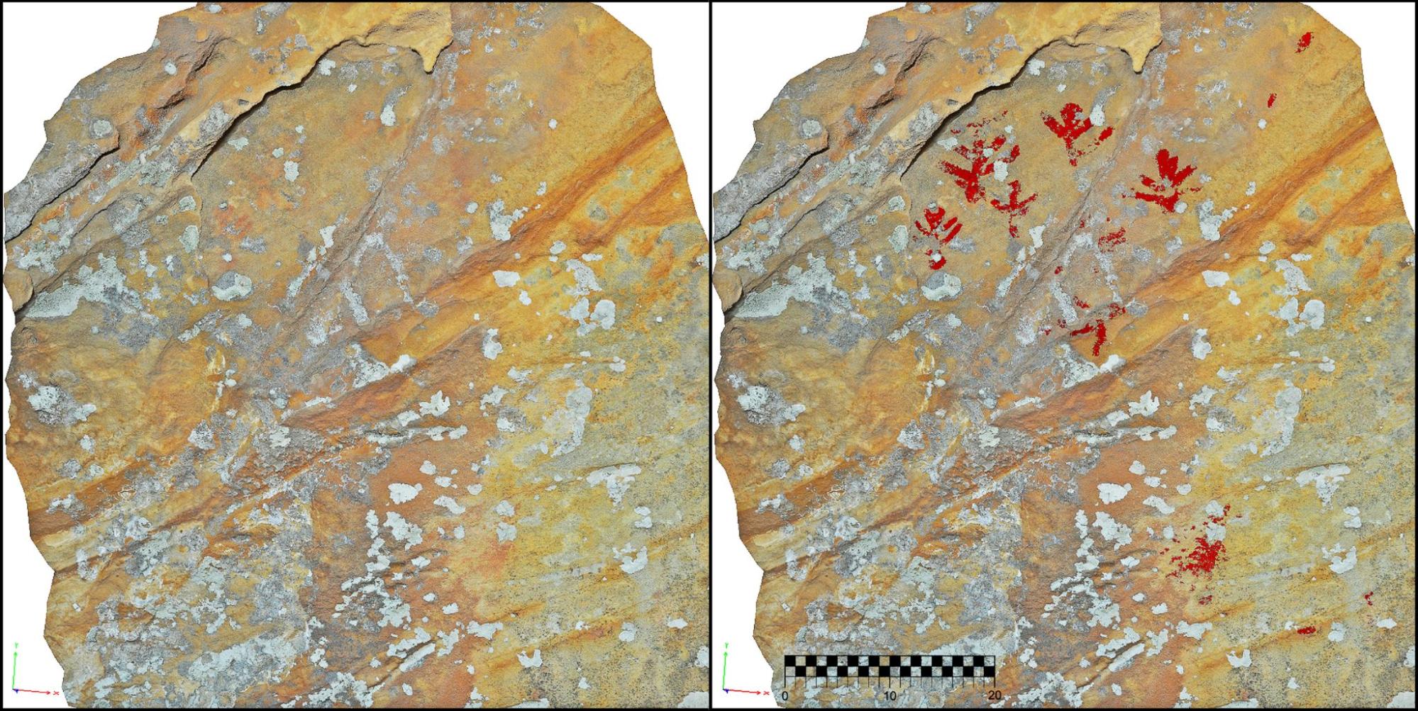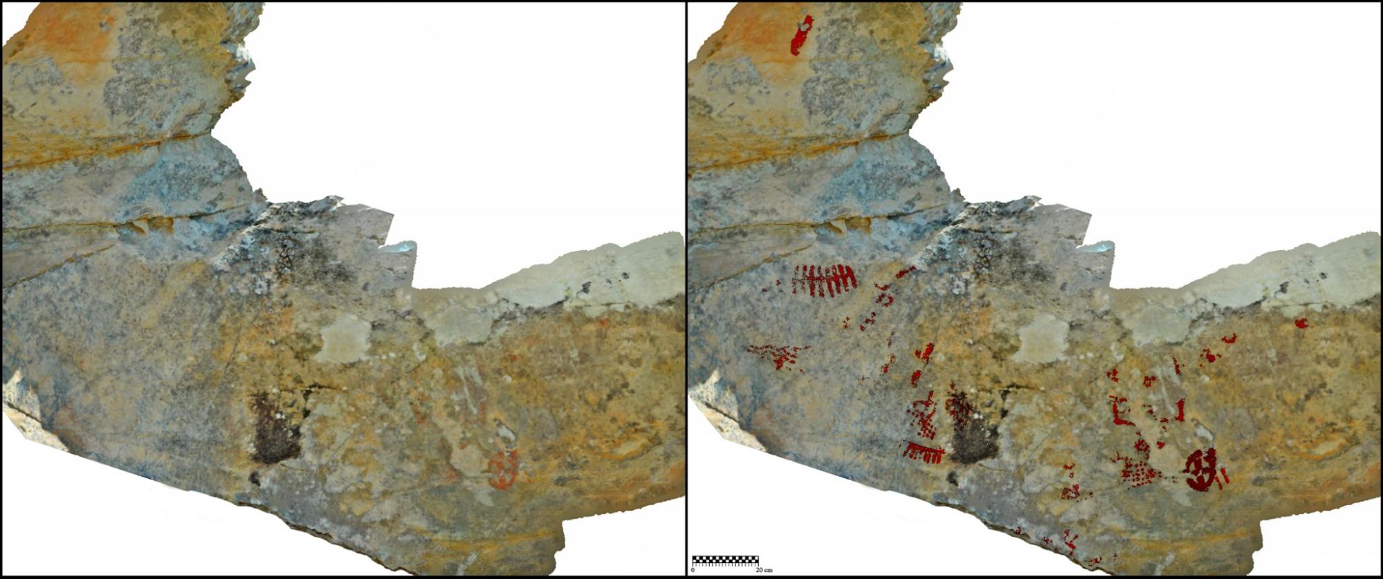 Ortofoto y calco superpuesto del panel III ubicado en la oquedad derecha de la cueva de las Mujeres II, Medina Sidonia, Cádiz). (Fuente propia).