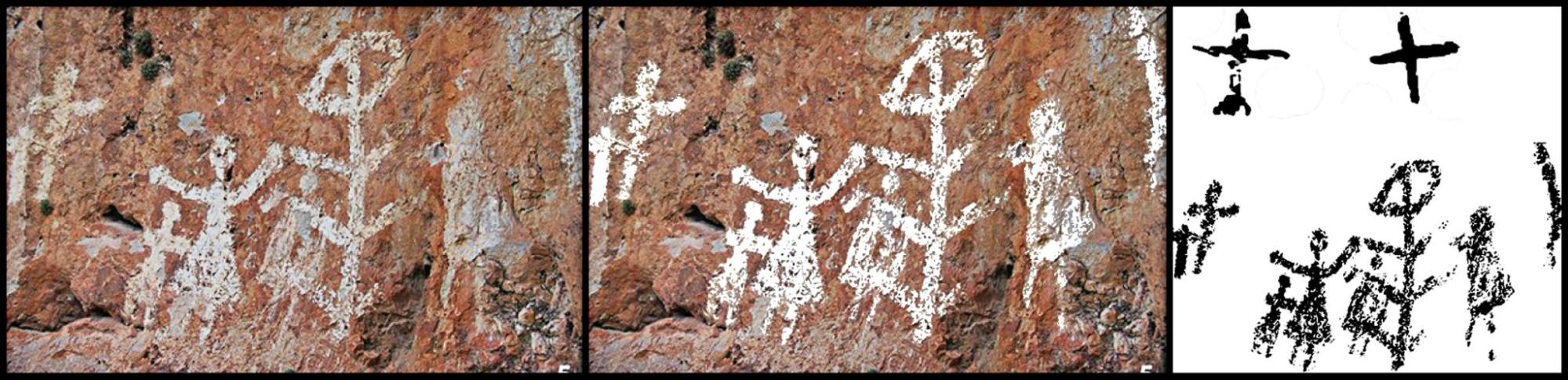 2. Calco de motivos: Ha consistido en un cribado de píxeles por semejanza cromática de los registros procesados; la selección de puntos que definen cada figura se ha efectuado con el software Corel Photo-Paint 2020.