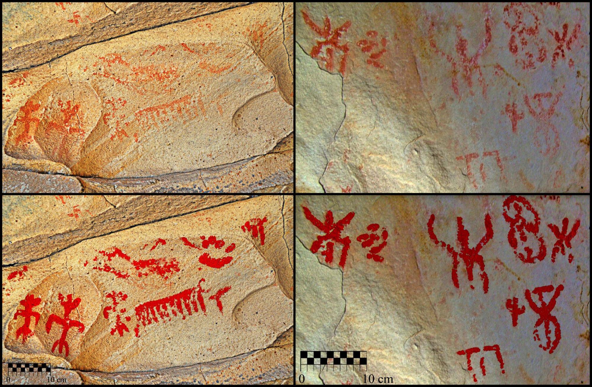 En este conjunto se observa un motivo girado 180º, la interpretamos como una persona tumbada con brazos estirados y no fallecida o boca abajo. Respecto a la composición inferior, la incorporación de estos motivos respondería a aportar ciertos detalles para una interpretación más precisa del acontecimiento representado inicialmente en la parte superior. Una ejecución a la inversa implica empezar a dibujar casi a ras de suelo, a 40 cm, existiendo zonas vacías más apropiadas. Se dibujaron dos motivos con apéndices simples y tres con múltiples brazos sin una secuencia concreta. En menor número, se asemeja a lo descrito en la parte superior-izquierda o primera escena, o bien, pudiera reflejar algún episodio previo que complementa a los representados en la parte superior. En resumen, la combinación/agrupación de antropomorfos y figuras alegóricas nos permite establecer dos reglas de relación. Estas unidades de contenido son de carácter simbólico-ritual y creemos que reproducen determinadas costumbres o cultos; bien reflejan dos eventos o dos secuencias de un mismo acto social. En contraposición, se dibujaron en un enclave semioculto a media altura de un terreno abrupto no apto para aglomerar personas; solo la base del recinto de unos 30 m2 sería útil para tal propósito.
