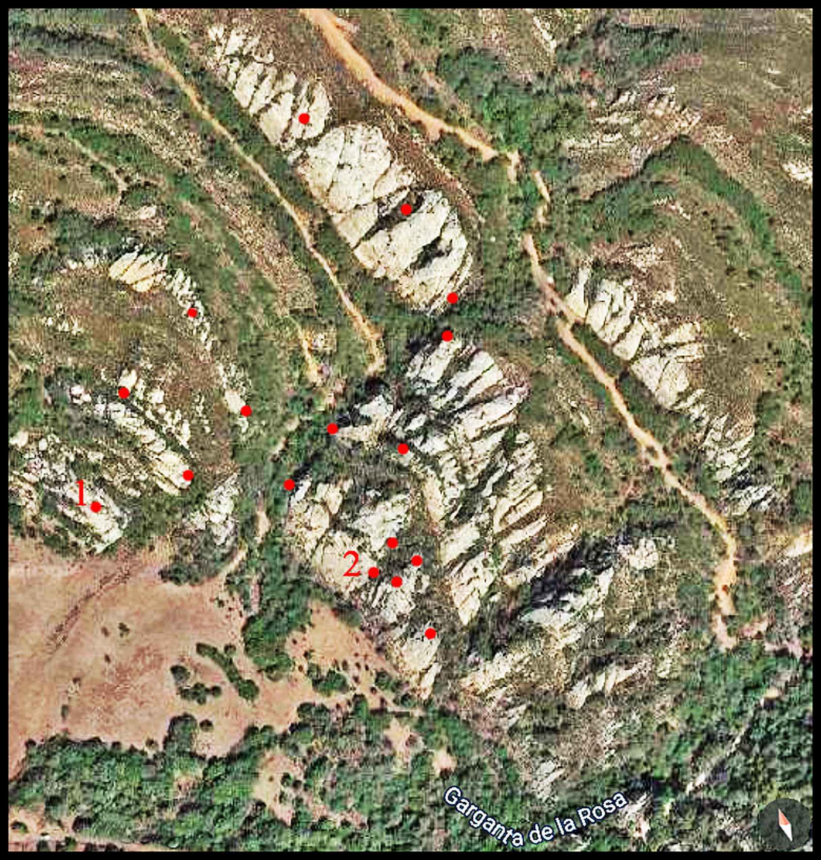 Ejemplo de sector prospectado con alta concentración de tafonis y cavidades con manifestaciones prehistóricas: 1. Cueva de los Libreros; 2. Cueva de la Rosa. (Fuente propia).