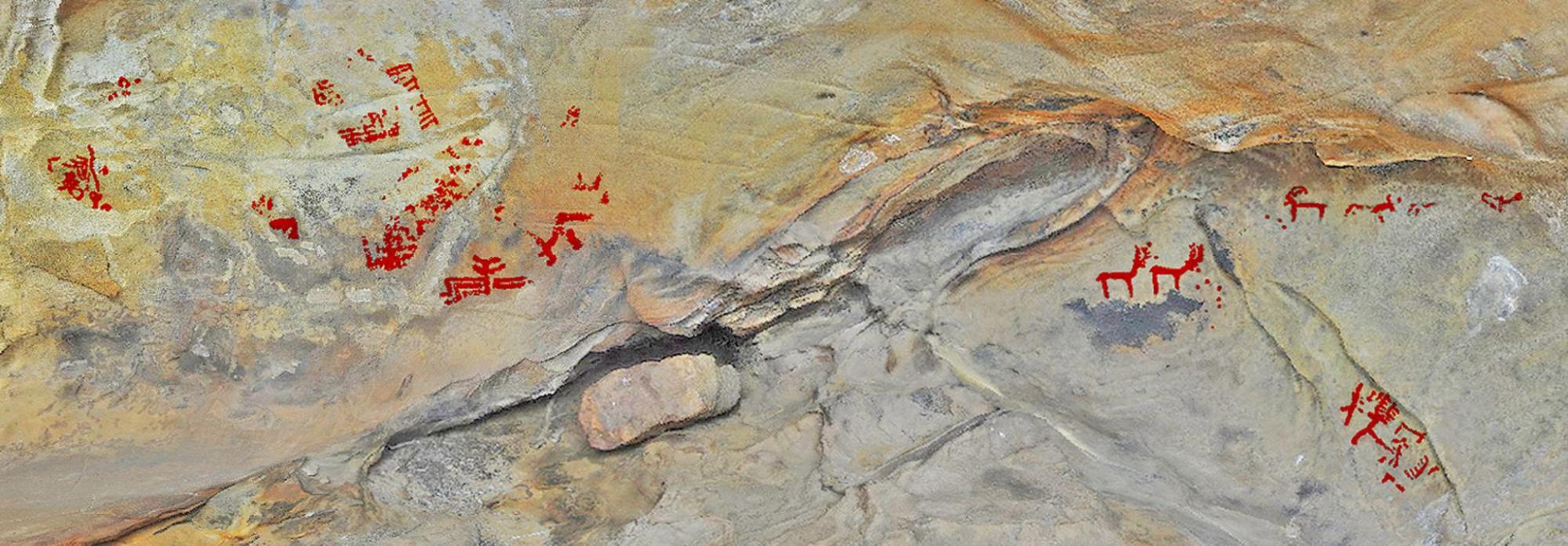 El corpus de figuras que hemos documentado en estas oquedades no solo se adscribe a etapas prehistóricas. Existen cavidades con manifestaciones vinculadas exclusivamente al fenómeno del grafito histórico, desde el Medievo hasta época contemporánea, y paneles donde los grafitis y figuras prehistóricas comparten espacio, técnica de ejecución y parámetros de representación, cuestiones que dificultan su identificación. Respecto a las manifestaciones prehistóricas, son de asignación postpaleolítica, existiendo diferencias entre ellas. Algunas son de tendencia naturalista con parámetros de representación semejantes a los encontrados en el Tajo de las Figuras; otras tienen un diseño acorde a las facies del A.R.E., es decir, ejecución con trazos simples, animales con pocos detalles, signos de difícil interpretación, alto grado de abstracción... En ocasiones, estos estilos conviven en las estaciones (Figura 3). Centramos nuestra investigación en un conjunto de emplazamientos que presentan una homogeneidad entre sus paredes decoradas. Son paneles monotemáticos que se configuran con una iconografía compartida basada en antropomorfos, bitriangulares y halterioformes, de brazos alzados. La agrupación e interacción de estas figuras conforma unas composiciones escénicas que manifiestan la reproducción de determinadas costumbres o cultos, ofreciéndonos una imagen de la sociedad en la que se enmarcan. En muchos de estos lienzos se dibujaron figuras alegóricas, con multiplicidad de brazos, reflejo del mundo espiritual o místico de unas comunidades que prosperaron en este entorno durante la Prehistoria Reciente.