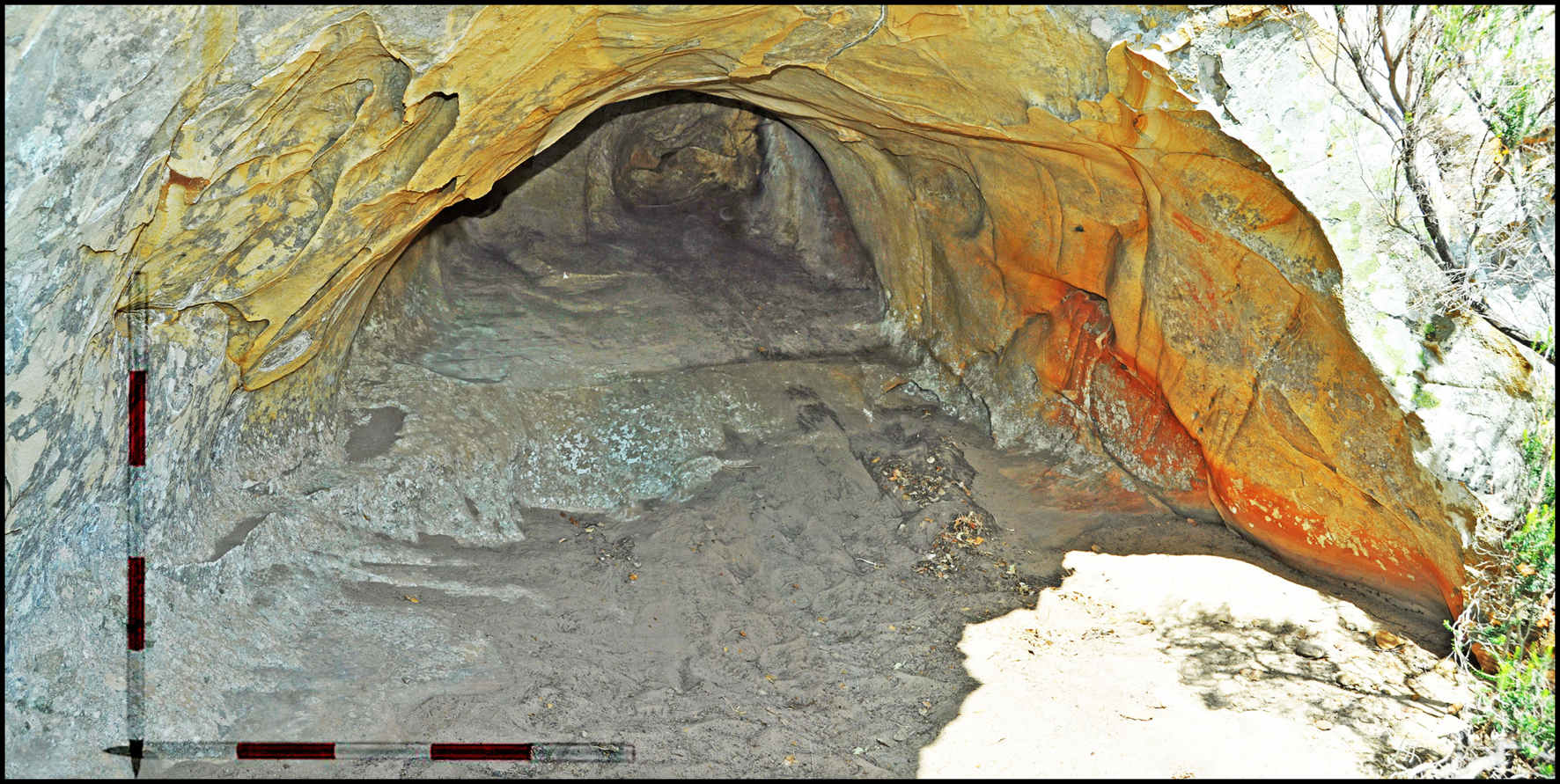 La cueva que hemos denominado de la Ahumada II o Mujeres II, por encontrarse a 60 m del yacimiento de la Ahumada o Mujeres, se ubica en el punto más alto del bloque de arenisca. Desde su cúpula se visualizan en una panorámica de 360º las sierras circundantes, gran parte de las tierras inundables de la extinta Laguna de la Janda y la costa atlántica, distante 18 km. Es el recinto decorado más pequeño de este conjunto de cavidades y está conformado por dos habitáculos de reducidas dimensiones: el izquierdo mide 4 m de profundidad y el derecho 6 m, la altura y anchura media para cada habitación es de unos dos metros. En el exterior se podrían aglomerar un cierto número de personas al poseer una plataforma, de suelo irregular y ligera pendiente, con dimensiones aproximadas de 7 m de largo y 4 de ancho. Las oquedades se orientan hacia el noreste y sureste; sus paredes más expuestas solo sufren erosión por vientos de levante. Entre las zonas más resguardadas, distinguimos tres áreas pintadas, una en la covacha izquierda y dos en la derecha. La composición de la oquedad izquierda es la más homogénea, a excepción de un motivo inferior que clasificamos como una mancha o resto indeterminado; el conjunto posee uniformidad en parámetros como tonalidad, grosor de trazo, dimensiones y temática, indicios de un único acto de ejecución (Figura 11).